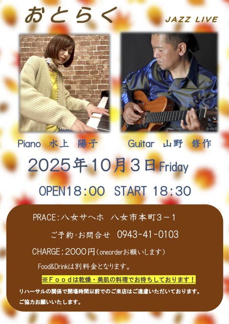 NEWS & TOPICS TOP NEWS & TOPICS 八女市 水上陽子(P)/山野修作(G) ニュース & トピックス NEWS & TOPICS 八女市 水上陽子(p)/山野修作(g) 2025.10.03 2025年10月3日(金) 18:30〜 八女サヘホ水上陽子(p)/山野修作(g) ニュース・トピックス一覧を表示