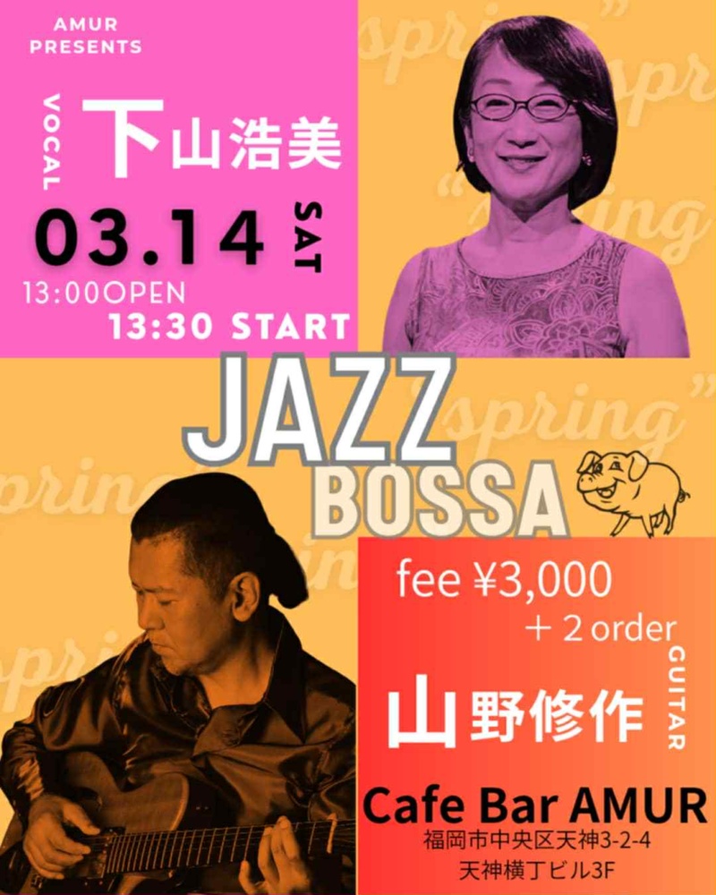 NEWS & TOPICS TOP NEWS & TOPICS 福岡市 下山浩美(VO)/山野修作(G) ニュース & トピックス NEWS & TOPICS 福岡市 下山浩美(vo)/山野修作(g) 2026.03.14 2026年3月14日(土) 13:30〜 AMUR下山浩美(vo)/山野修作(g) ニュース・トピックス一覧を表示