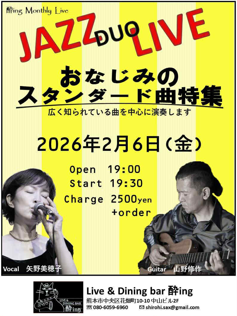 NEWS & TOPICS TOP NEWS & TOPICS 熊本市 矢野美穂子(VO)/山野修作(G) ニュース & トピックス NEWS & TOPICS 熊本市 矢野美穂子(Vo)/山野修作(g) 2026.02.06 2026年2月6日(金) 19:30〜 酔ing矢野美穂子(Vo)/山野修作(g) ニュース・トピックス一覧を表示