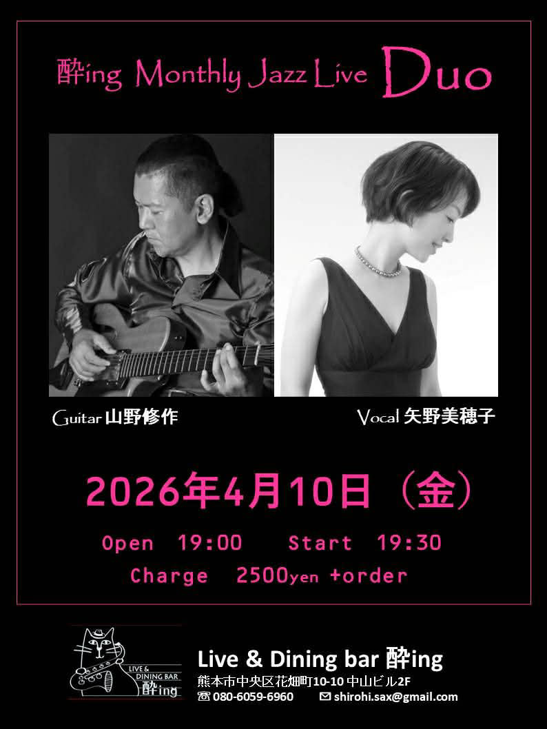 NEWS & TOPICS TOP NEWS & TOPICS 熊本市 矢野美穂子(VO)/山野修作(G) ニュース & トピックス NEWS & TOPICS 熊本市 矢野美穂子(vo)/山野修作(g) 2026.04.10 2026年4月10日(金) 19:30〜 酔ing矢野美穂子(vo)/山野修作(g) ニュース・トピックス一覧を表示