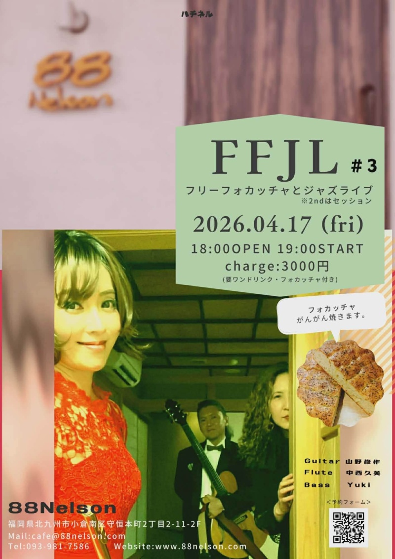 NEWS & TOPICS TOP NEWS & TOPICS 北九州市 中西久美(FL)/山野修作(G)/YUKI(B) ニュース & トピックス NEWS & TOPICS 北九州市 中西久美(fl)/山野修作(g)/yuki(b) 2026.04.17 2026年4月17日(金) 19:00〜 88Nelson中西久美(fl)/山野修作(g)/yuki(b) ニュース・トピックス一覧を表示