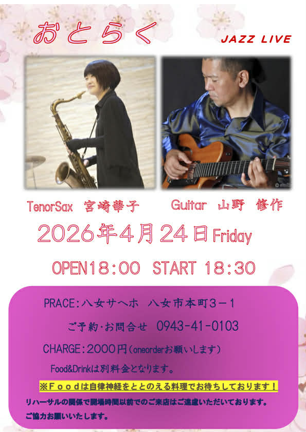 NEWS & TOPICS TOP NEWS & TOPICS 八女市 宮崎華子(TS)/山野修作(G) ニュース & トピックス NEWS & TOPICS 八女市 宮崎華子(ts)/山野修作(g) 2026.04.24 2026年4月24日(金) 18:30〜 八女サヘホ宮崎華子(ts)/山野修作(g) ニュース・トピックス一覧を表示